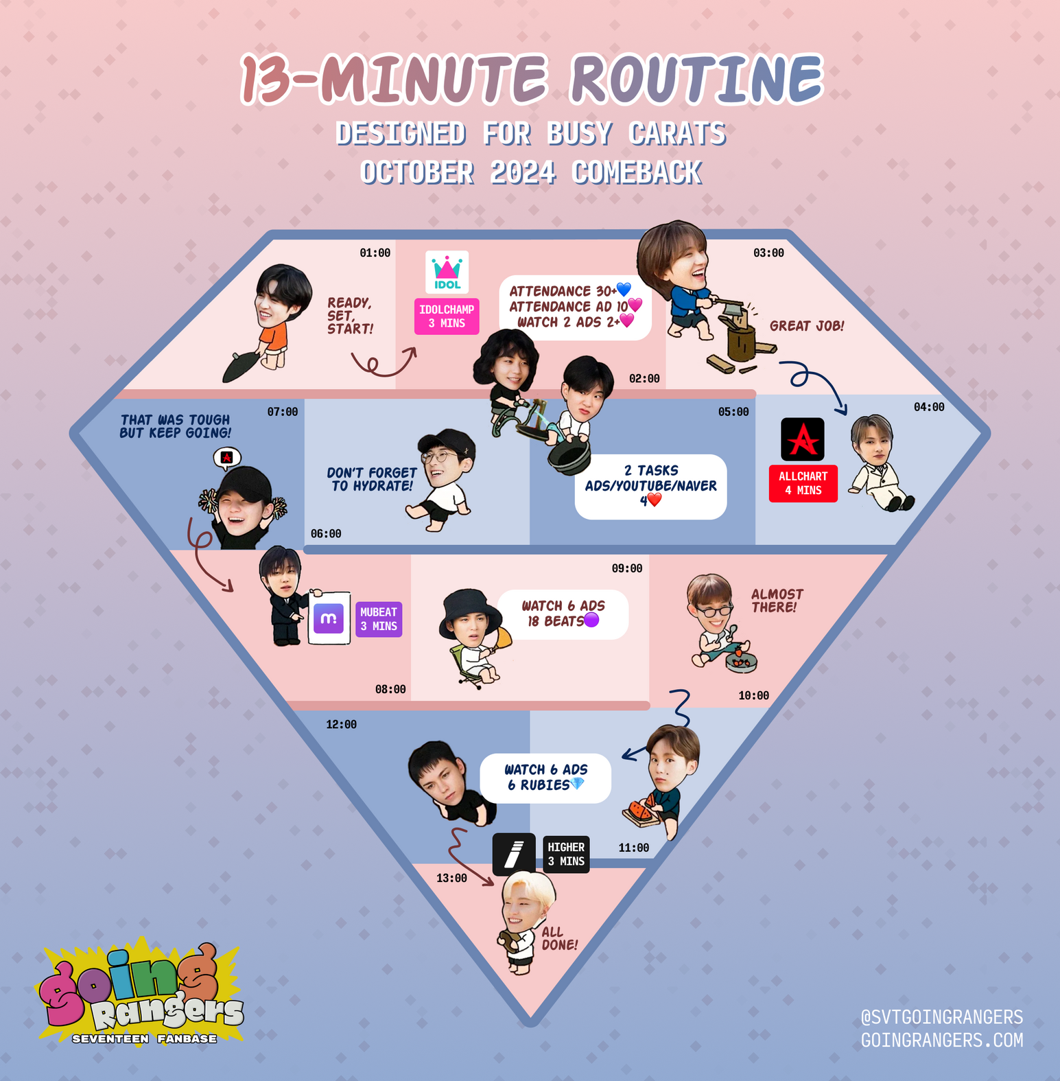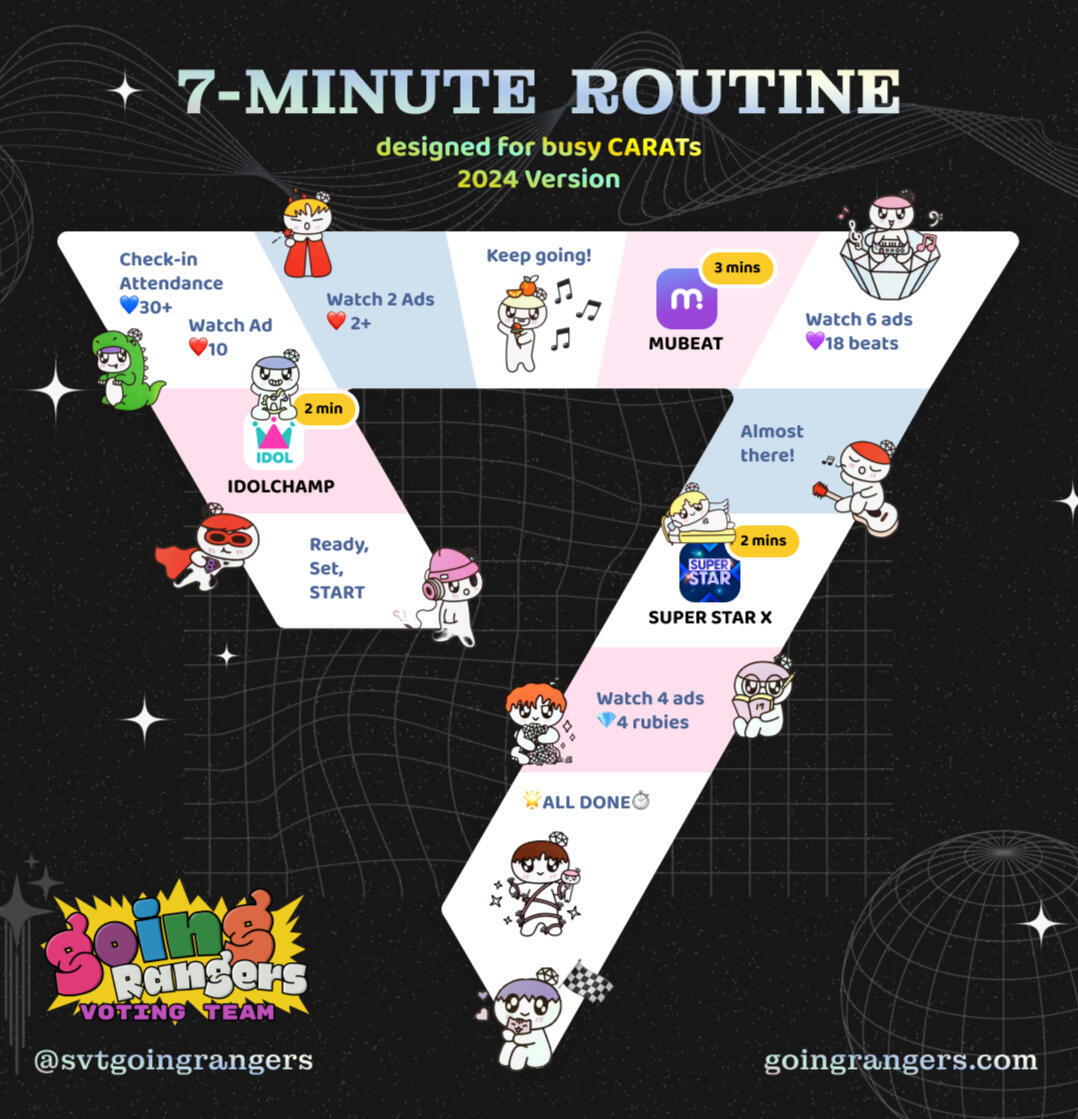 Going Rangers created a 7-minute and 13-minute voting guide for busy CARATs. All you need is a few minutes daily to help SEVENTEEN win awards! These are specially important during comeback seasons!