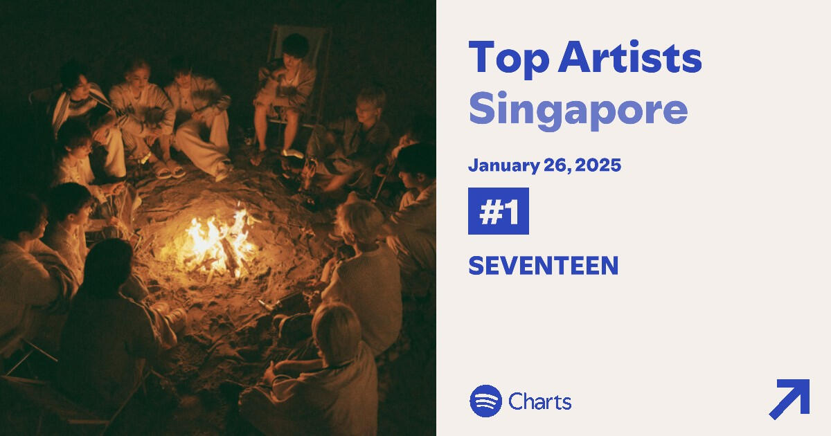On January 26, 2025, SEVENTEEN claimed the #1 spot on Spotify Singapore's Artists Chart, becoming only the second male Korean act in history to reach this milestone.Worldwide Carats also mentioned that it marks SEVENTEEN's first-ever #1 ranking on an artist chart in any country.